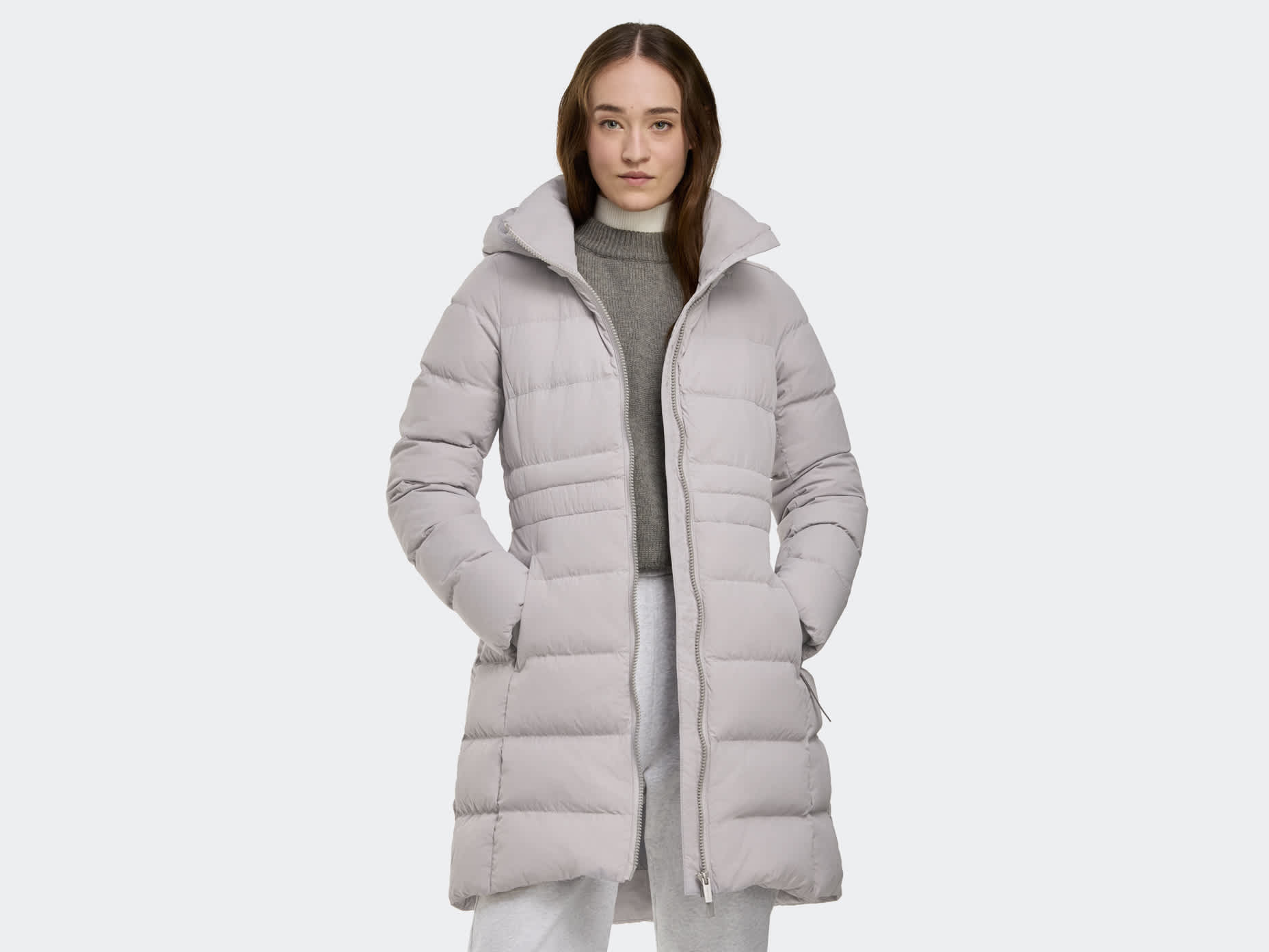 Clean, contoured lines enhance this mid-thigh length silhouette with customizable features.