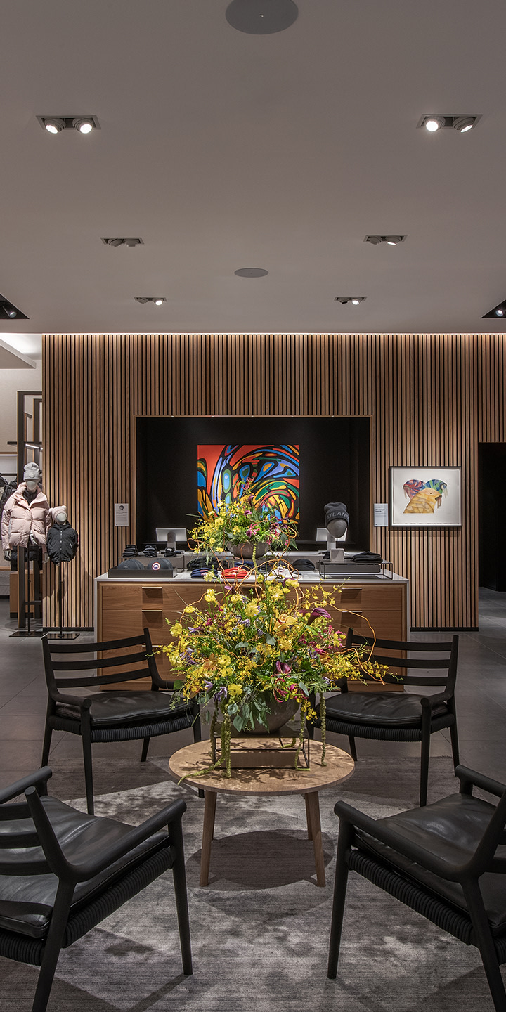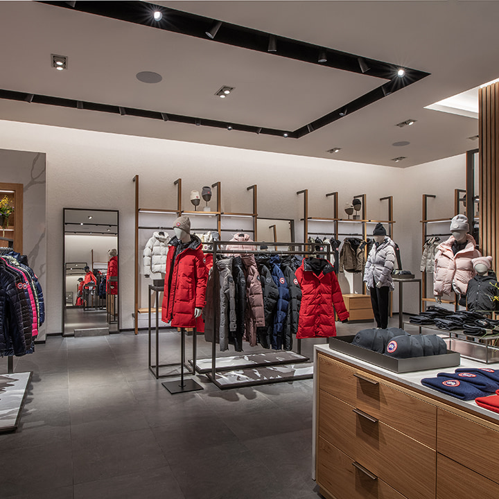 Every store is designed to reflect Canada Goose’s Arctic heritage. As you explore the Phipps Plaza location, you may notice unique sculptures and paintings by a variety of Inuit artists, as well as by local Atlanta-based artist, Vanna Black. The design concept is appropriately inspired by the great outdoors – soaring mountains, frozen glaciers, lush forests – complementing Canada Goose’s commitment and purpose to keep the planet cold, while keeping its people warm.
